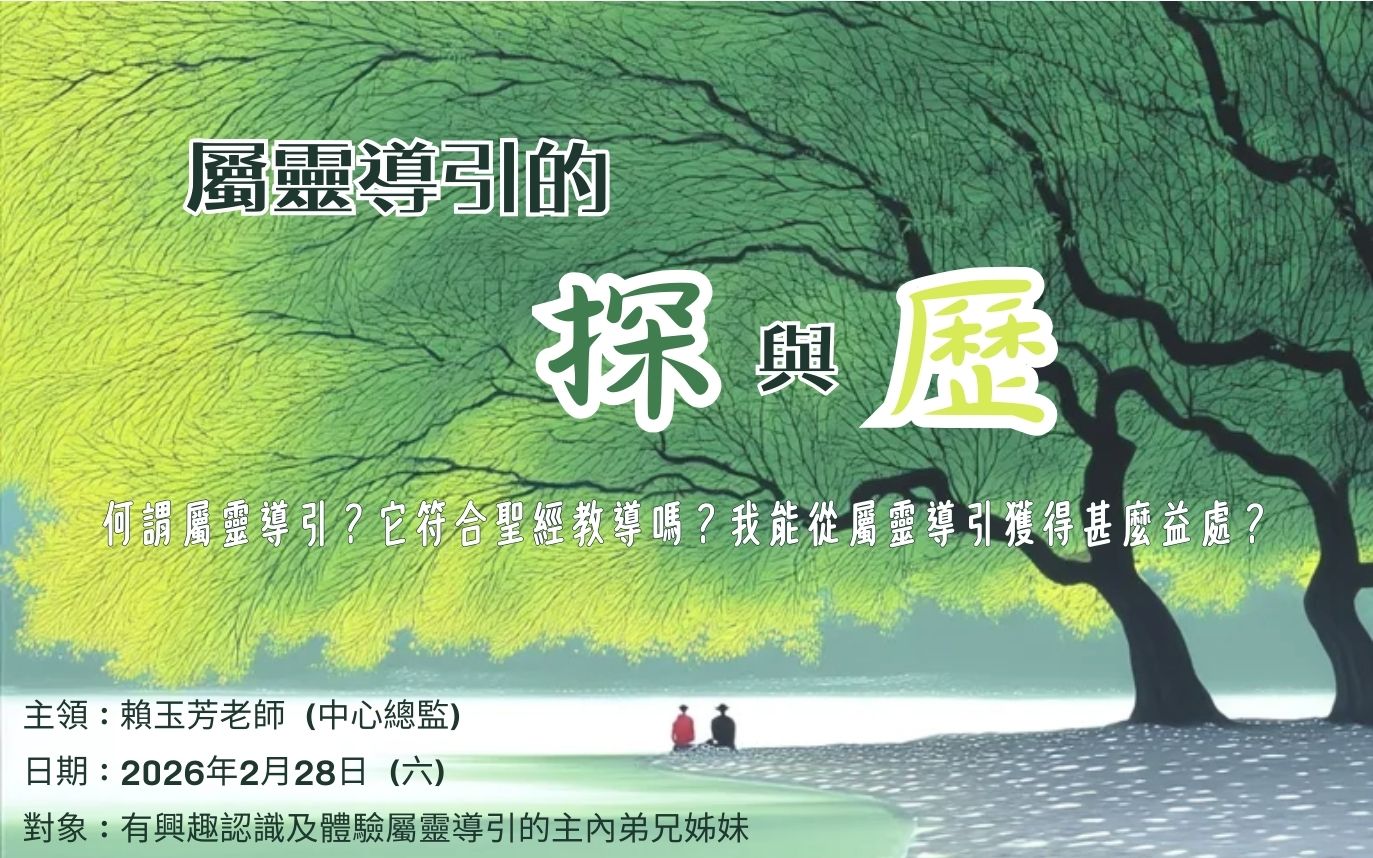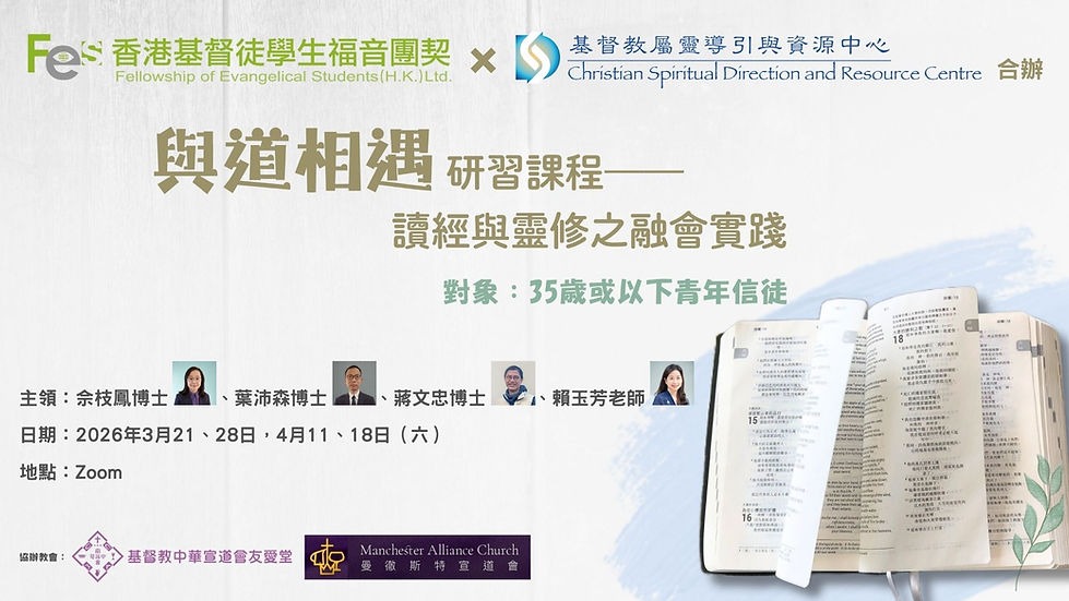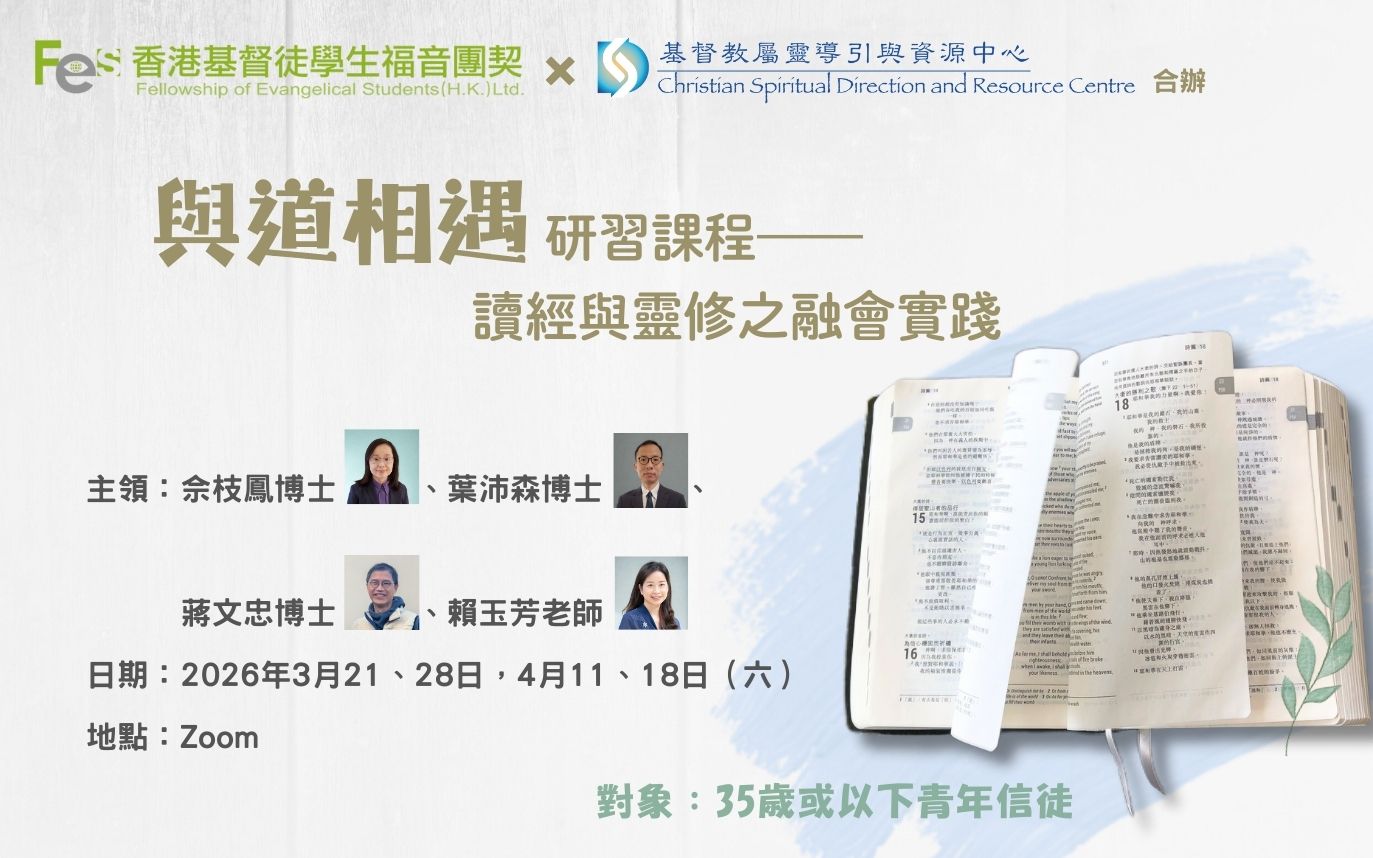 查經與靈修,兩種實踐的相遇,更立體進入聖道在生命中的臨在;跨地域的青年信徒,彼此聆聽與對話裡的相遇,在道中找到一份同行共鳴。 日期、時間、地點2026年3月21、28,4月11、18日(詳見活動內容) Zoom 活動內容對象:35歲或以下青年信徒 香港基督徒學生福音團契 及 基督教屬靈導引與資源中心 合辦 基督教中華宣道會友愛堂 及 曼徹斯特宣道會 協辦 本課程通過講解、查經與默想,明辨讀經是進入一種對話,經歷位格式的互動關係,當體會「道」的臨在與顯明,人在理智與靈性上可得蒙光照與塑造。 主領: 佘枝鳳博士(香港浸信會神學院基督教教育客座助理教授)
