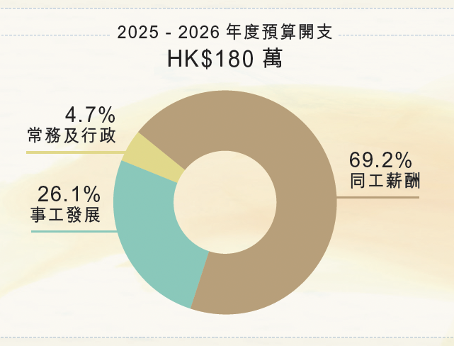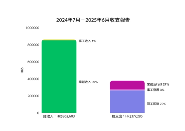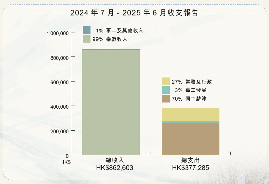 感謝神的豐富供應,2024-2025年度中,我們在中宣、教會和弟兄姊妹的支持下,不僅獲得了大家的認同,還在首個財政年度的七個月營運中錄得超過四十萬元的盈餘。然而,隨著2025/26年度各項事工的正式啟動,賴玉芳老師的任聘、新同工的加入,以及免息貸款的償還,我們的未來開支將顯著增加,